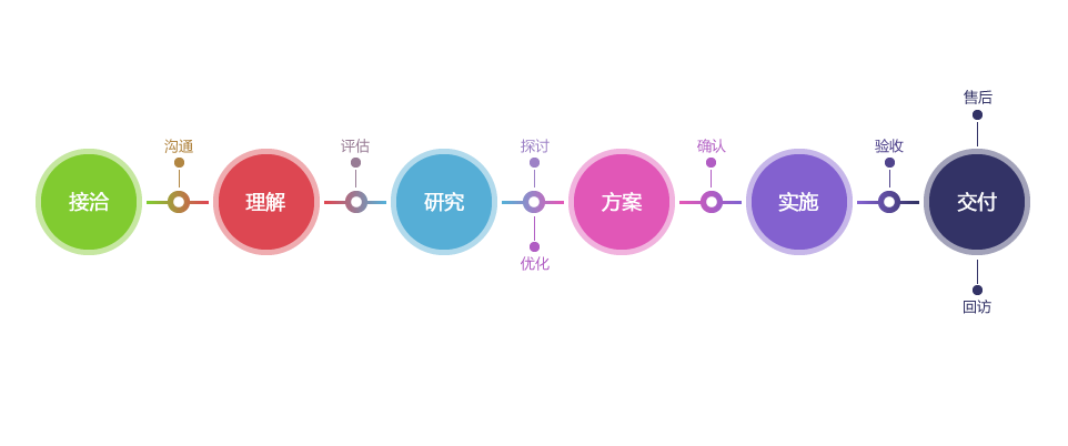 清晰、可視、可持續(xù)改進的研發(fā)流程服務,在每個環(huán)節(jié)我們都秉承著打造高品質移動互聯網解決方案的開發(fā)理念。